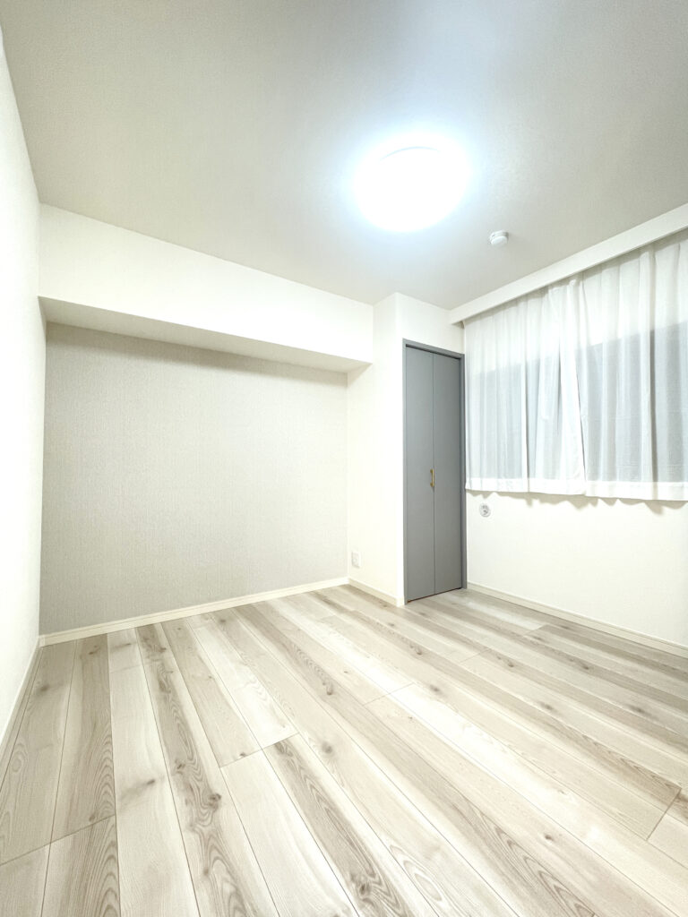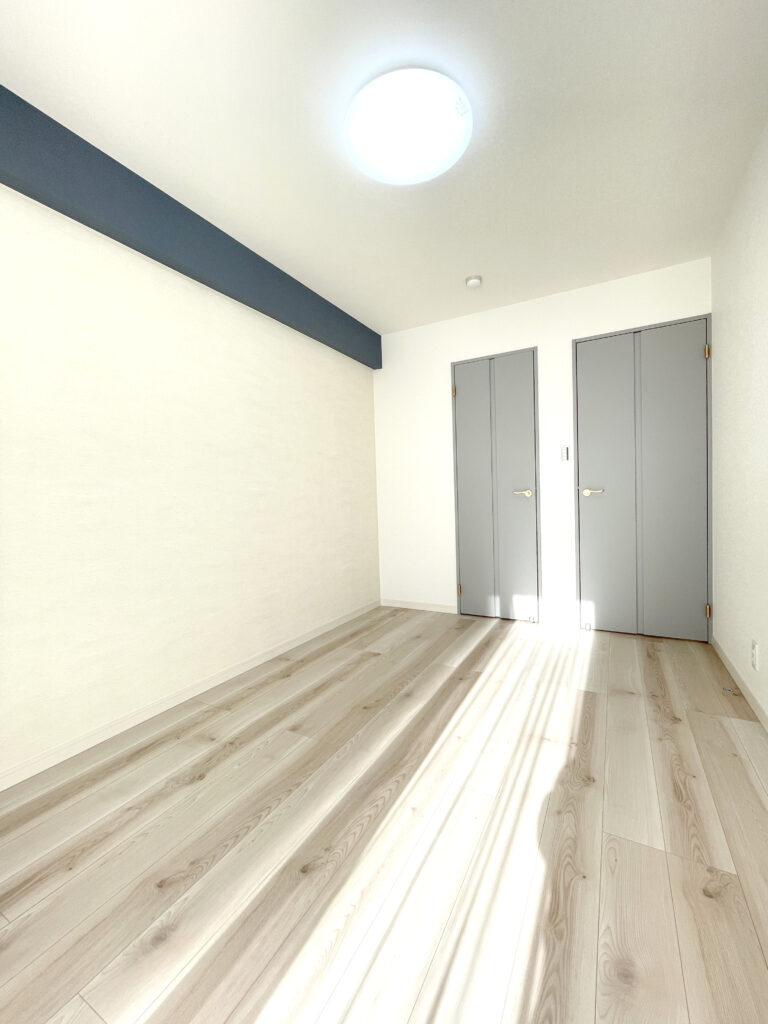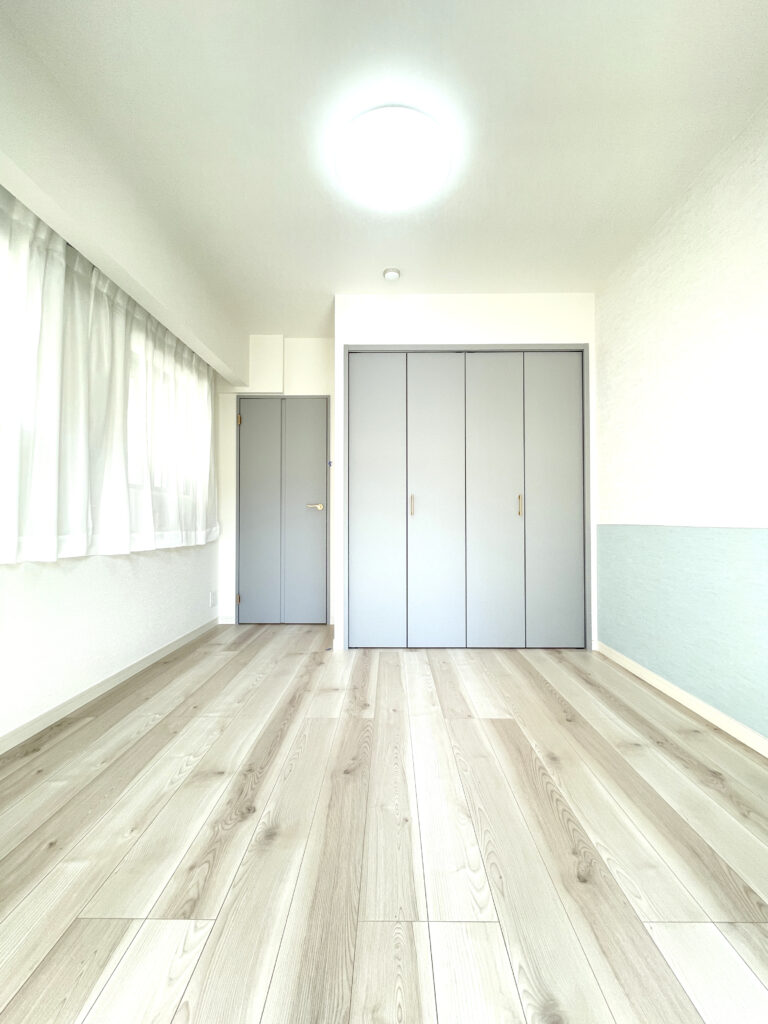 当時の間取りにて縦長に位置する洋室を正方形に近い形状の洋室にて2部屋からなるように間取変更を行いました。また、主寝室となる寝室については収納部をWICにすることで大容量の収納が可能になるように設計しました。