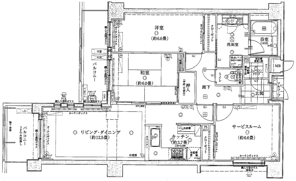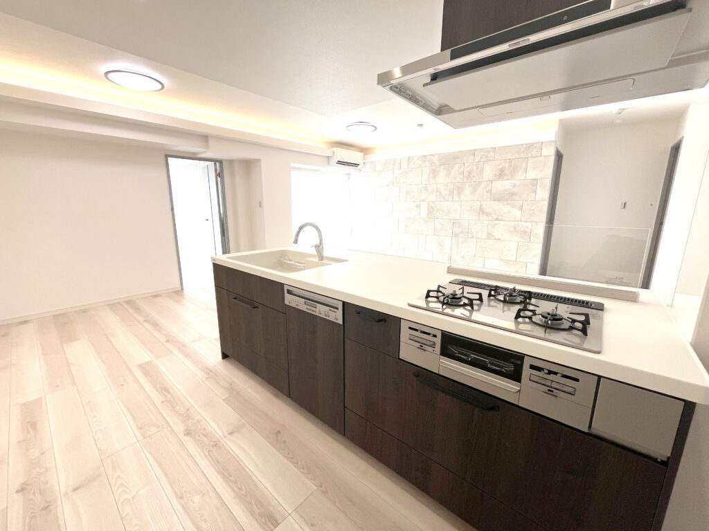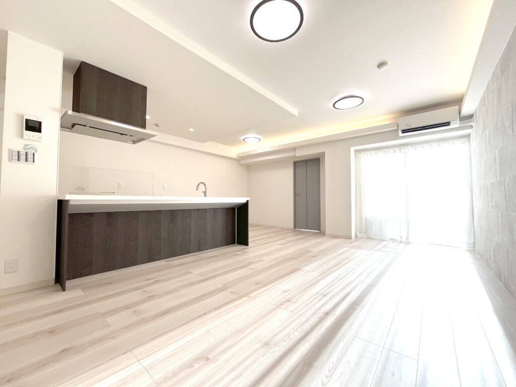 当時の間取であった80㎡近い2LDK+Sの間取に対し、今のライフスタイルに合わせると共に、内装設備にワンランク上の住設を使用しました。また廊下が蛇腹形状に長い間取であったためリフォームに合わせ廊下の幅を狭くし、家族が集うリビングダイニングを可能な限り広く空間を設ける設計としました。キッチンについても、間取の形状から料理好きな客層にはたまらないアイランドキッチンを採用しております。