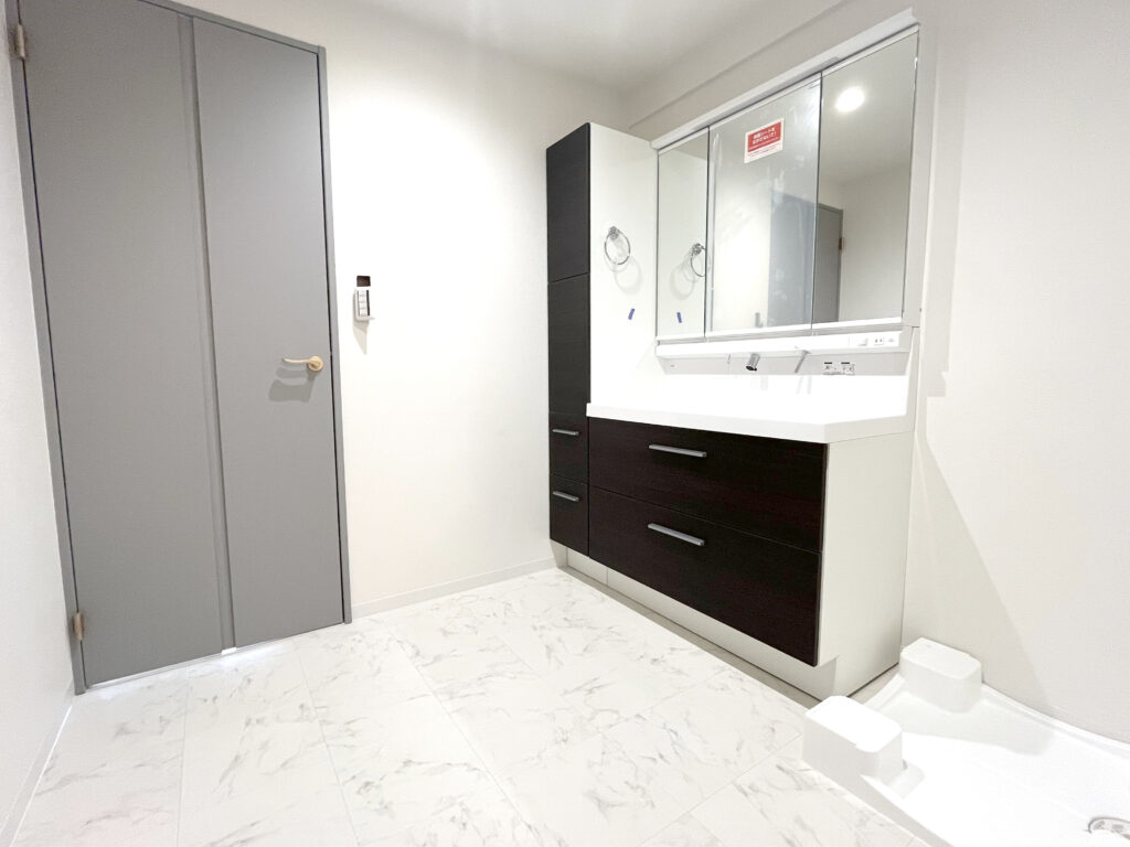 また、お部屋に入ったときに一番最初に目に留まるスペースのため大理石調のタイルや間接照明を用いた明るさと清潔感を意識した空間にしました。