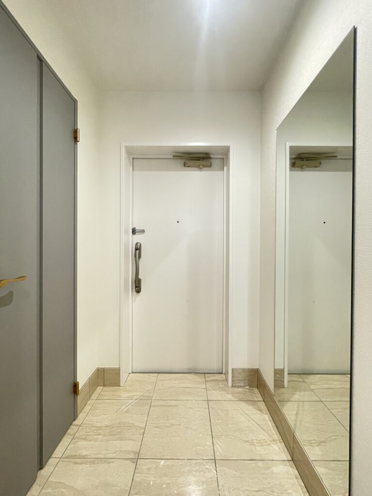 大型ミラー付きシューズボックスで、身支度もスムーズに出来ます。